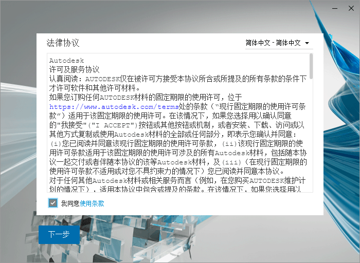 3、成功解压之后,在上方选择简体中文语言,勾选安装许可协议;
