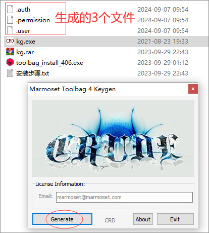 4、使用注册机kg.exe,点击Generate,生成许可文件;