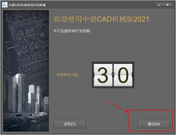 4、当我们运行软件时会提示试用30天,这里直接点击激活;