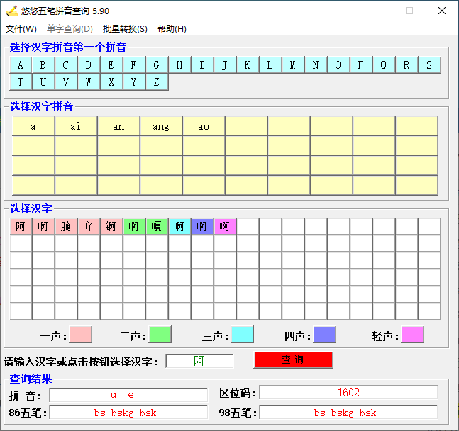 悠悠五笔拼音查询是一款非常强大的五笔编码查询器,能够有效的帮助用户查询到某个文帝在五笔编码,方便那些正在学习五笔的用户进行使用!此外,该软件不仅支持编码查询,还能够进行批量转换功能,能够将汉字快速转换成拼音、86五笔、98五笔、区位码,是目前功能最为齐全的一款查询工具!