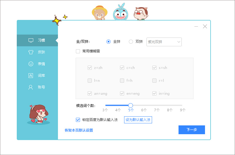 2、首次进入先进入快速设置,用户可以设置全拼或双拼,以及锁定百度为默认的输入法;