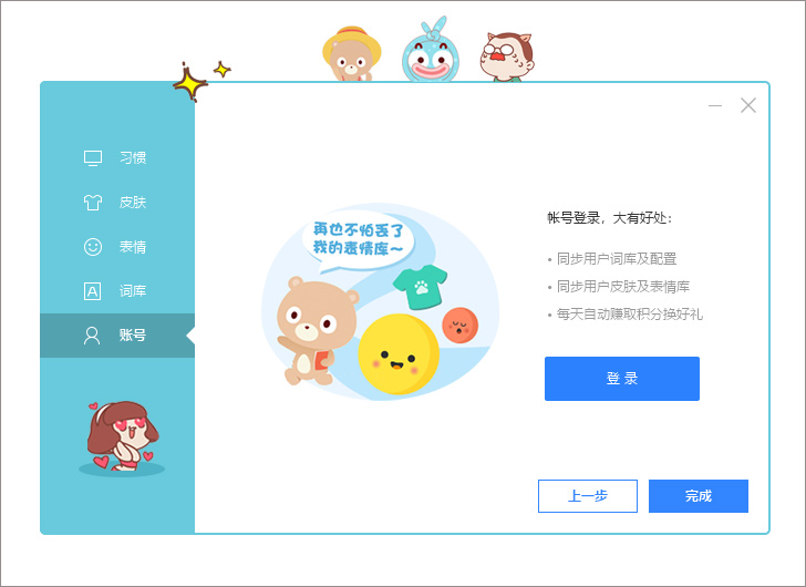 6、最后登录百度账号,可以同步用户词库、同步表情库、赚取积分等。