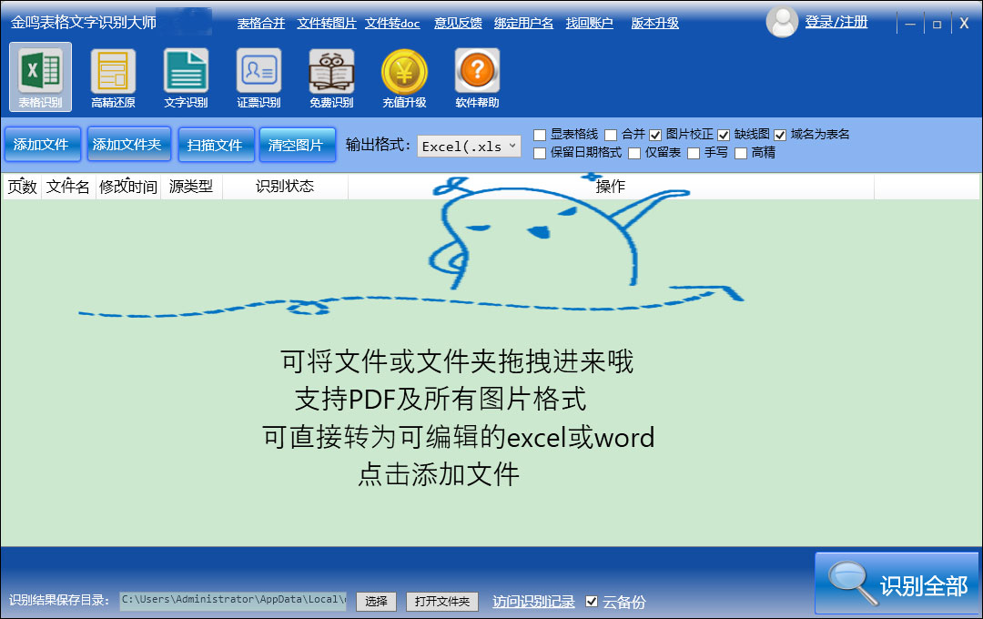 金鸣表格文字识别大师简称金鸣文表识别系统,这是一款便捷实用的图片转Word、Excel识别软件,支持多张图片批量精准识别,轻松节约用户大量的时间,而且效率也很高,在识别完成后该软件会自动默认保存为Excel文件格式,当然用户也可以自行设置改保持为Word格式。