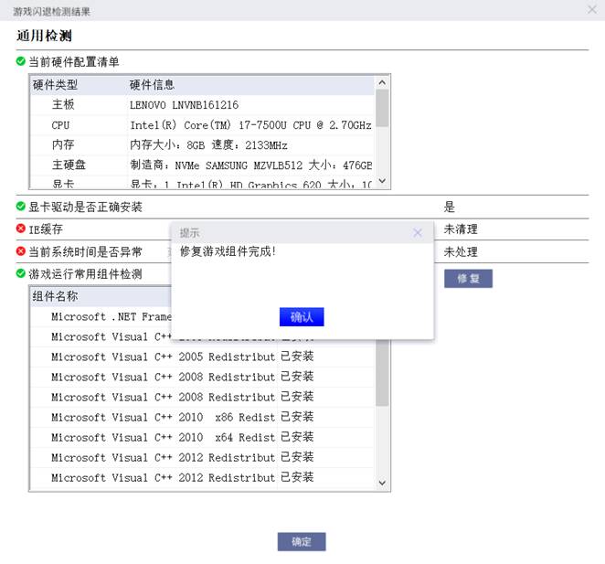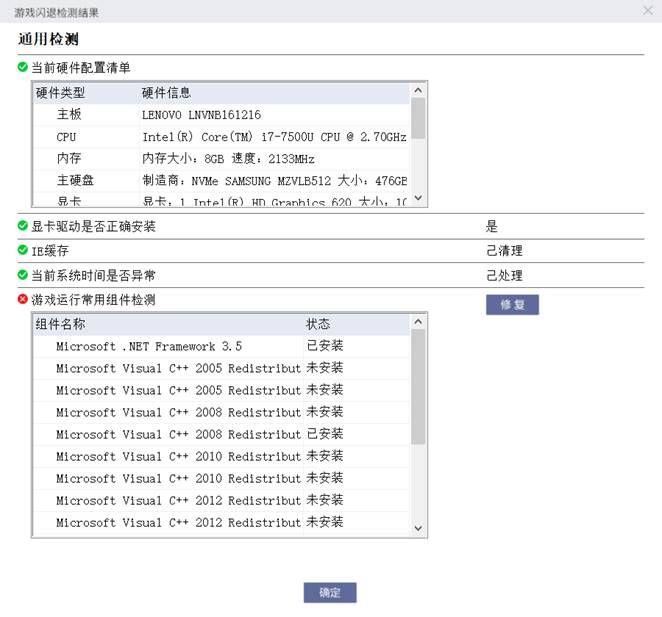 5、若检测结果中“游戏运行常用组件”有异常,则可以通过“修复”功能调取第三方工具进行修复