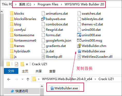 4、将crack激活文件文件WebBuilder.exe复制到软件安装目录下替换;