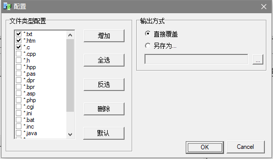①对文件中一对字符串所划定的区域进行处理,对于网页、编程源文件、这些文件的特点就是看上去非常的繁琐,不容易查询关键字等,比如txt、htm、c、h、cpp、asp、cpp、java等。通过点击工具栏上的“配置”,可以看到默认支持的文件类型,而且还可以“增加”进行定义没有的格式,同时,确定输出的方式,是直接在源文件上进行还是另外存储到别处
