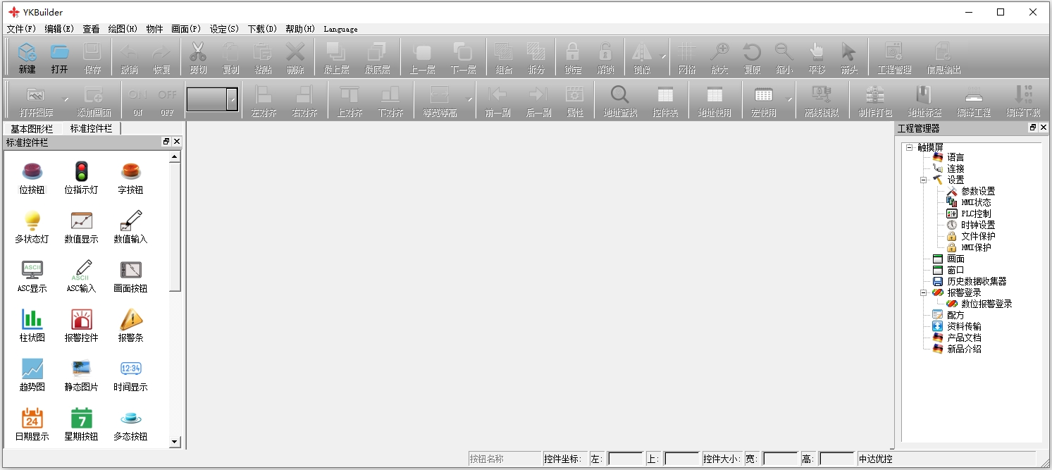 YKBuilder官方版也叫中达优控触摸屏编程软件,是由深圳市中达优控科技有限公司采用可编程控制器(PLC)核心技术研发的人机界面的集成开发环境。在设定下拉菜单中,它可以选择修改参数设定,也可以双击右侧工程管理器中设置选项中的触摸屏参数设置来修改参数,并以动画显示、报警处理、流程控制和报表输出等优异的性能方式解决实际工程问题,在各行各业的应用都受到越来越广泛的关注,如纺织机械、卷染机械、塑料橡胶机械、注塑机、包装机械、超声波设备等。它能够帮助用户开发适合自己工程的组态,进而减少开发自动化项目的时间,缩短系统升级和维护时间,降低整个工作流程的成本,有需求的朋友不妨下载尝试。