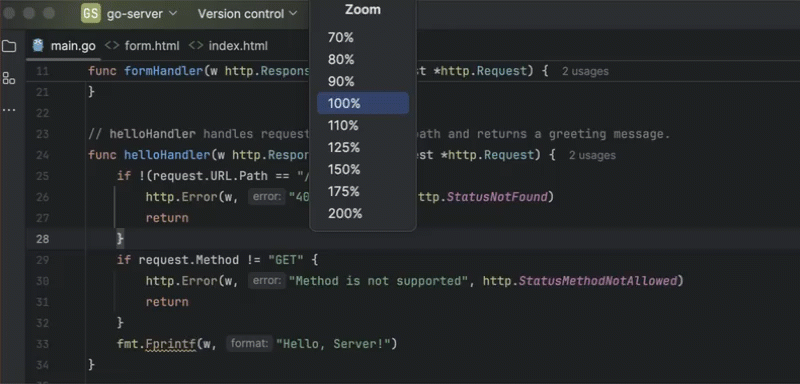 GoLand 2024.1 提供了缩小整个 IDE 的选项。 最初,缩放范围仅包括放大到 100% 到 200% 之间的选项。 在当前版本中,您可以将 IDE 缩小到 90%、80% 或 70%。