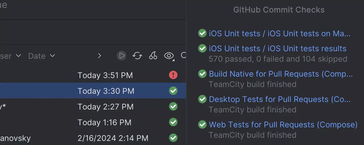 我们在 Git 工具窗口的 Log(日志)标签页中引入了一个新列,使您可以轻松审查 CI 系统执行的 GitHub 提交检查的结果。 点击标签页即可查看 CI 检查的完整详细信息。