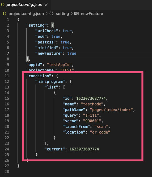 编译条件会读取 project.config.json 中的 condition 字段下的相关配置,方便导入编译条件。
