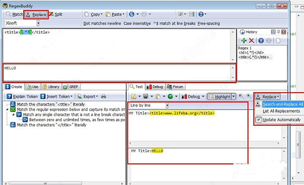 1、Replace按钮,显示的面板会由稍微的不同。下面的界面显示了,对匹配到的正则内容,替换为HELLO的效果;