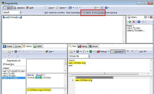 4、^$ match at line breaks:对^$只会对开始的字符串或者结束的字符串做匹配,如果选中该选项,则可以对前后换行也支持。选中后,效果如下:前后都有行,可以匹配出来。