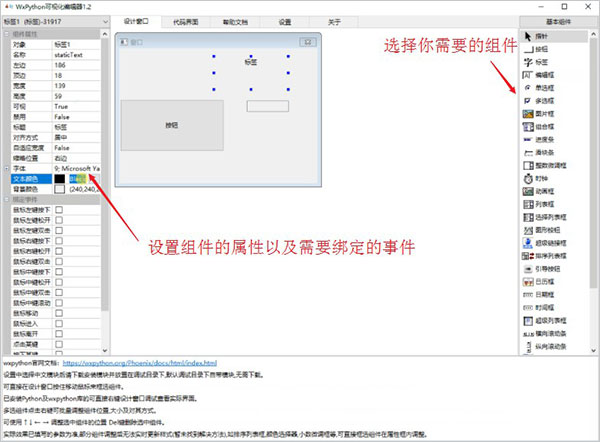 3、接着在右边的基本组件中选择自己所需要的组件拖入到设计窗口中,并在左边的选项中选择组件的属性以及所绑定的事件;