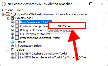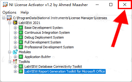 13、以同样的方法将“LabVIEW 2021”下所需项目右击选择【Activate】(所有项目显示绿灯说明激活成功),点击右上角的【X】关闭