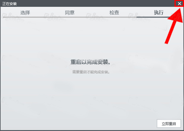 9、显示重启以完成安装,点击右上角的【X】关闭界面