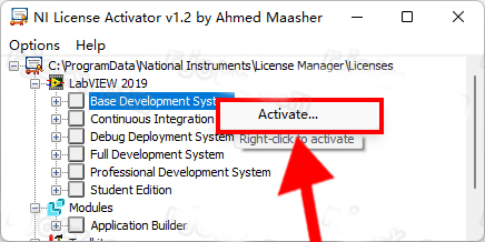 11、运行NI License Activator 1.2.exe文件,鼠标分别右击【BaseDevelopment System】【Debug DevelopmentSystem】【Full DevelopmentSystem】【Professional DevelopmentSystem】【Student Edution】【ApplicationBuilder等】,点击【Activate】