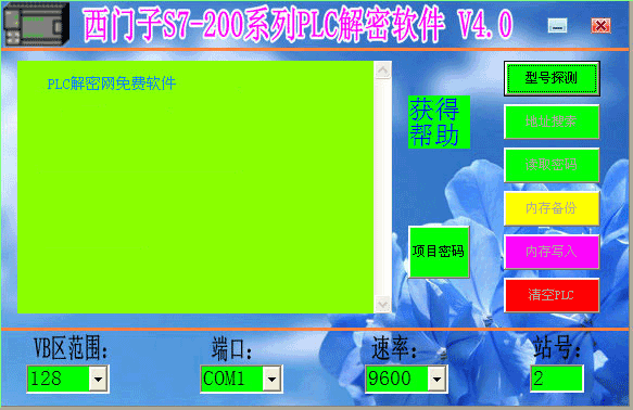 本款西门子s7-200解密软件基本可以确定PPI协议所能破解的西门子S7-200PLC的范围:02.00版以下的,包括部分02.00版本(确切的说是最高只有3级加密功能的plc),通过本软件就可以轻松破解,02.00版以上的,包括02.00版(精确定位是-具备4级加密功能的2.0版本)和所有的200CN型号,只有拆机解密,迄今为止还没有更好的办法!关于版本号,你通过本软件就可以探测到。使用方法