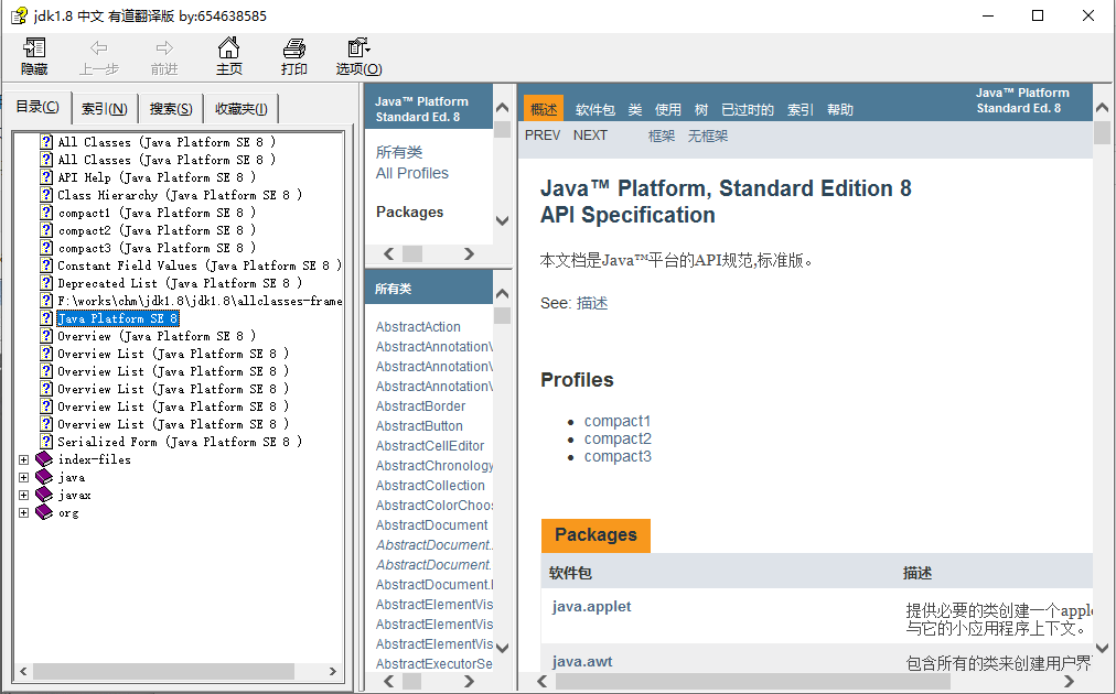 java类库非常的庞大,提供了许多实用的类供程序使用,在进行java编程时,我们常常需要使用java类库所提供的这些类,这些类对程序的功能和质量起到了非常重要的作用。但很多初学者并不熟悉java类库,为此小编特别带来了java api 1.8中文版下载,chm格式,包括中文版、英文版以及有道翻译版,详细的介绍了对应的类,接口,框架等详细信息,可以帮助编程人员更快更好的学习java api,以便更好的提高编程能力,欢迎免费下载收藏。