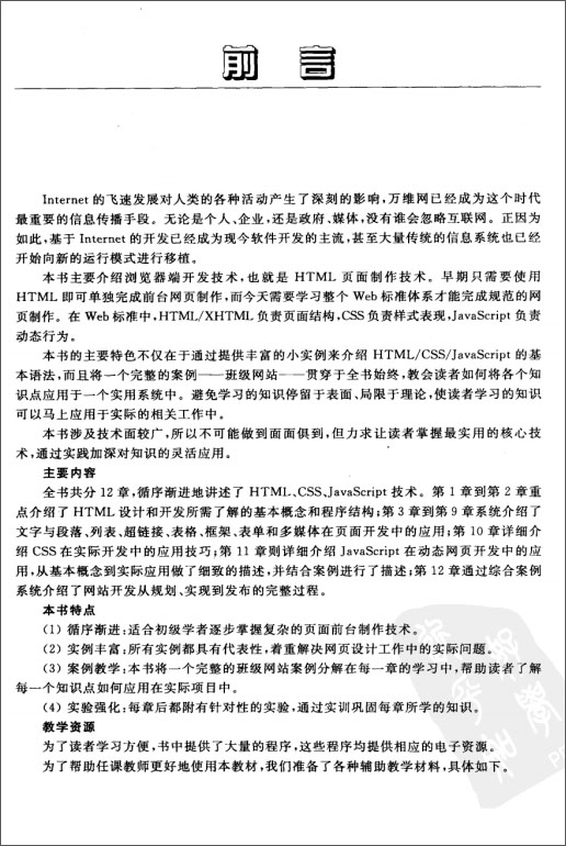 网页设计与开发:HTML、CSS、JavaScript实例教程是一本讲解HTML、CSS、JavaScript语言的实战web开发指导手册,由郑娅峰编著。全书主要介绍了浏览器端开发技术,也就是HTML页面制作技术,包括HTML、CSS和JavaScript,其中HTML/XHTML负责页面结构,CSS负责样式表现,JavaScript负责动态行为。全书不仅在于通过提供丰富的小实例来介绍HTML/CSS/JavaScript的基本语法,而且将一个完整的案例——班级网站——贯穿于全书始终,教会读者如何将各个知识点应用于一个实用系统中。避免学习的知识停留于表面、局限于理论,使读者学习的知识可以马上应用于实际的相关工作中,适用于学习web开发的人员阅读。