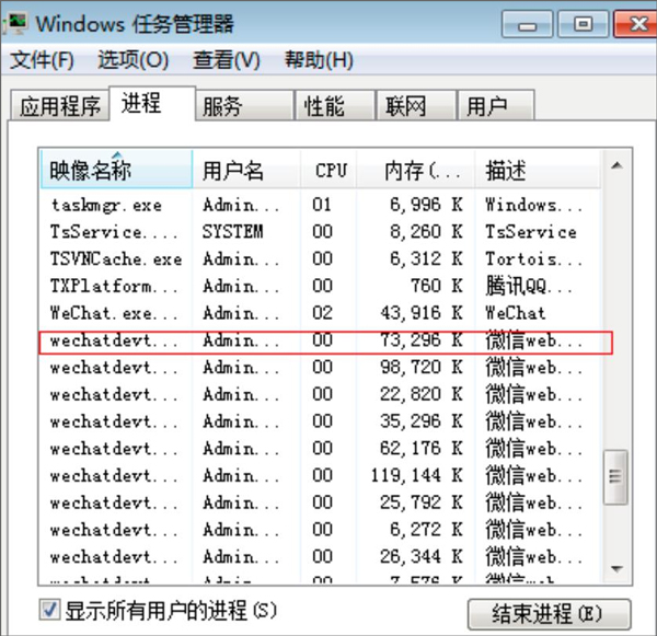 解决二:在任务管理器中关掉微信web开发者工具和其他相关程序,再重新启动下微信web开发者工具即可。