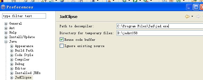 4,把 jad.exe 放在系统路径中,(例如 C:\Program Files\Jad\jad.exe),然后 在Eclipse中选择Window > Preferences… > Java > JadClipse > Path to Decompiler,填写jad.exe的路径,在Directory for tempcrary files中填写临时文件路径,如下图