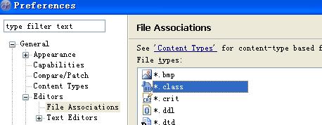 5,选择,Window > Preferences… > General > Editors > File Associations 选择*.class文件,如下图