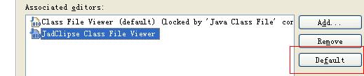 选择 Associated editors 选中 JadClipse class File Viewer ,选择右边的 Default 按钮,如下图