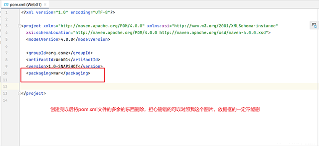 6、删除pom.xml中多余内容,只留下面的这些内容,注意打包方式 jar和war的区别