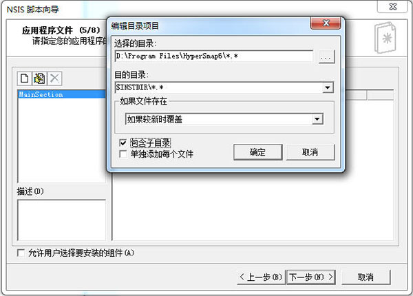 第五步,选择要打包的文件,直接把要打包的目录内容全部添加进来,注意两处*.*,以及勾选“包含子目录”,不要勾选”单独添加每个文件“,编译的时候会把所有的文件打包进来的,下一步