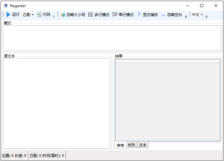 Regester是由一款功能强大的正则表达式测试器,它能允许你测试和分析正则表达式。不仅如此,它还支持仅使用表达式里的选中部分进行匹配,支持树形、表格和文本等三种结果查看方式,支持拖入文件作为匹配源文本,支持忽略大小写、单行模式、多行模式、忽略空白、显式匹配和ECMAScript等各种选项,功能非常的强大。