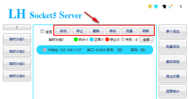 11、然后勾选您添加的服务器,通过顶部的按钮启动或关闭服务器,还可以记性删除,修改。流量,刷新等。