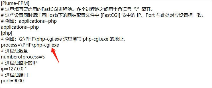 5、在 php 节下方 “process=” 右边,输入安装好的 php-cgi.exe 的程序位置,保存关闭