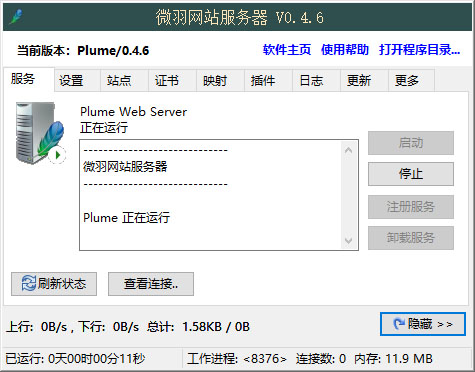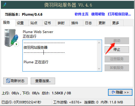 6、在 Plume 主界面重新启动 Plume 服务,来使设置生效(停止--启动)