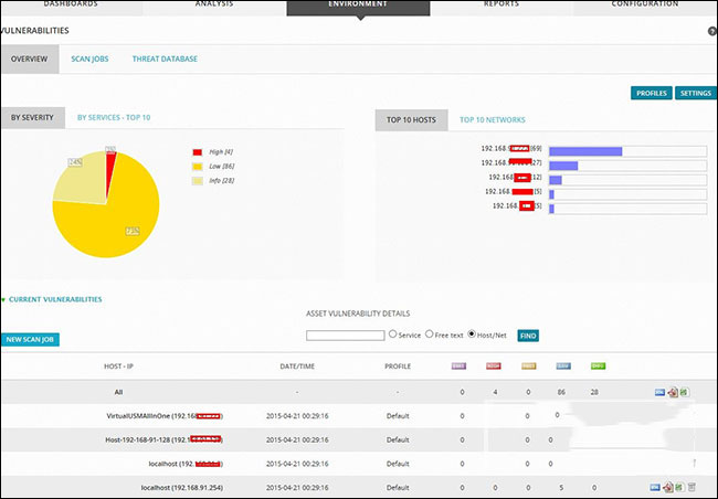 ③ 在“ENVIRONMENT”界面,可以通过“Enable Availability Monitoring”实现Nagios监控,可以执行漏洞扫描,可以详细显示资产细节(漏洞、报警、事件、可用性、服务、所属组)等;