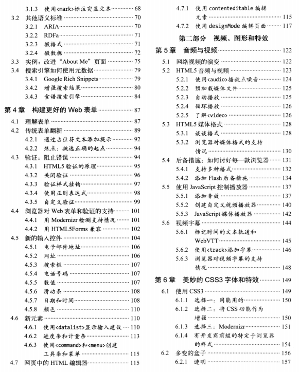 HTML5秘籍(第2版)共包括四个部分,共13章。第一部分介绍了HTML5的发展历程,用语义元素构造网页,编写更有意义的标记,以及构建更好的Web表单。第二部分介绍了HTML5中的音频与视频、CSS3、Canvas绘图技术等内容。第三部分介绍了数据存储、离线应用、与Web服务器通信,以及HTML5与JavaScript技术的强大结合等内容。第四部分为附录,简单介绍了CSS和JavaScript。html5秘籍第2版章节目录