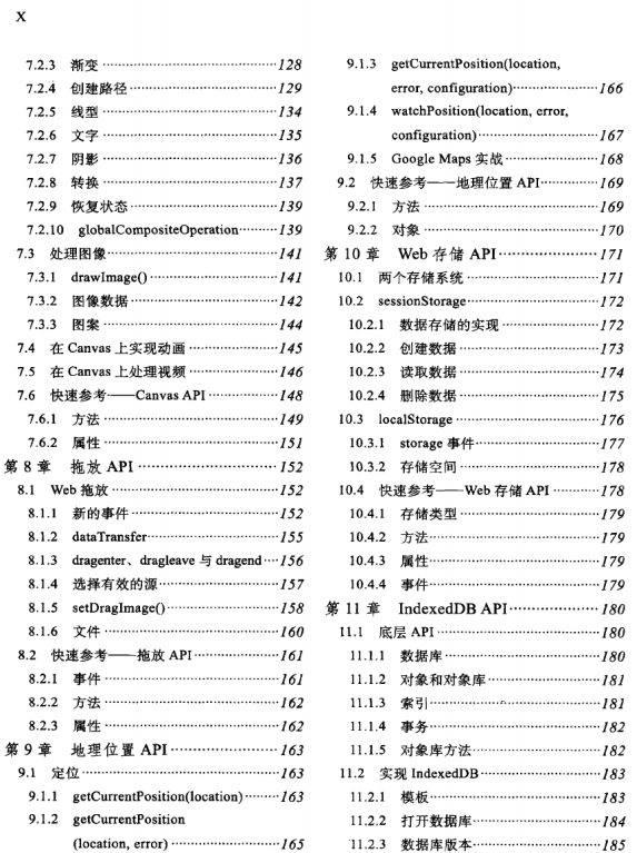 第1章 HTML5文档1 第2章 CSS样式设置与框模型24 第3章 CSS3属性63 第4章 JavaScript81 第5章 视频与音频94 第6章 表单与表单API108 第7章 Canvas API125第8章 拖放API152 第9章 地理位置API163 第10章 Web存储API171 第11章 IndexedDB API180 第12章 文件199 第13章 通信API229 第14章 Web Workers API253 第15章 历史API265 第16章 脱机API273