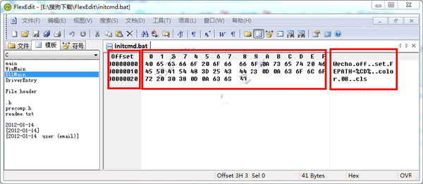 3、单击鼠标左键或者使用Tab键将光标位置移动到十六进制区域和ASCII码区域进行编辑,在文本编辑区选择需要修改或者查看的十六进制编码,在主程序窗口下部的状态栏可以查看相应的偏移地址、文件修改实践、文件大小等信息。在十六进制区域内,只有0-9、A-F和a-f是正确的字符;在ASCII码区,任何可打印字符都是正确的。