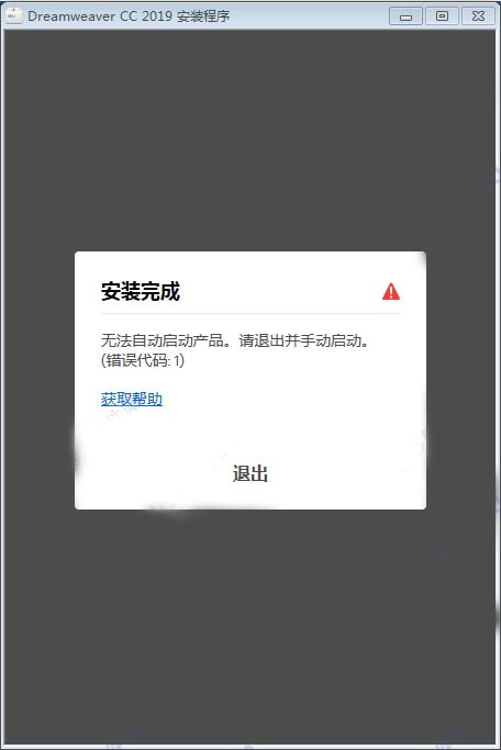 5、如果弹出提示“无法自当启动产品,请退出并手动启动(错误代码:1)”,点击退出;