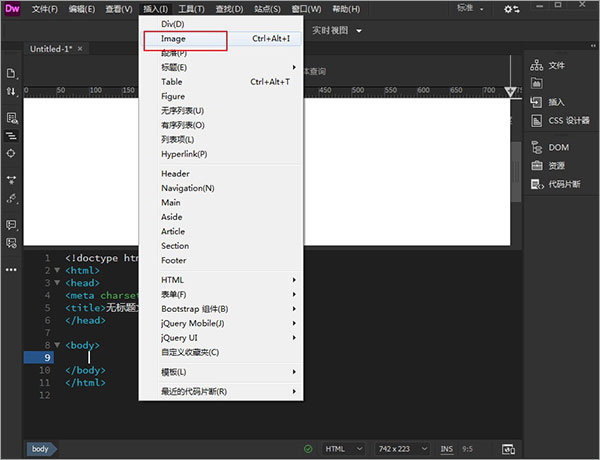 4、初学者可以把dw设置为【设计】界面,方便边做边查看效果。然后我们点击【插入】—【image】来插入一张图片;