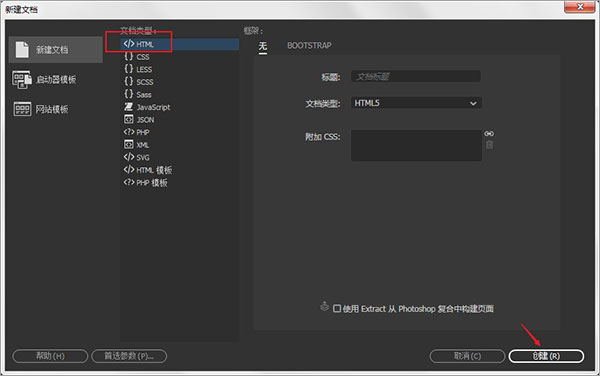 2、在【新建文档】弹窗中选择文档类型为【HTML文档】,点击【创建】;