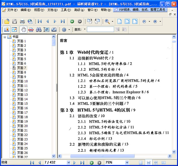 总的来说,这本书不仅技术新颖,实战性强,还考虑到了用户体验,比如附带阅读器这种小细节。我觉得它特别适合前端开发者或者想转行学Web技术的人,尤其是那些喜欢通过案例学习、讨厌枯燥理论的人。如果你正在找一本靠谱的HTML5和CSS3教程,这本绝对值得下载来看看,我自己是打算好好啃一遍,把那些新特性都实践一遍。HTML5与CSS3权威指南是一款非常不错的pdf高清版电子书,它是目前市场上最权威的HTML5与CSS3实战教程,详细的讲述了html 5和css3的所有新功能和新特性,技术新颖,实战性能,再配以精彩的案例讲解,能够帮助用户快速掌握HTML5与CSS3编程技巧。另外软件包中附带了pdf福昕阅读器,以方便用户即下即用。