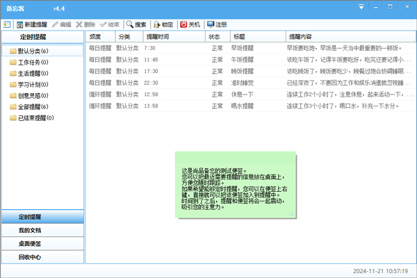 尚品备忘客是一款非常好用的任务提醒软件,您预先设置好时间,到了时间软件会播放音乐提醒你,提醒的事项可以自定义,默认的分类有:工作任务、生活提醒、学习计划、创作灵感、全部提醒、已结束提醒,还有定时关机和锁定功能,让您离开一会的时候,保证你资料的保密性。软件用户界面友好,操作方便,有需要的朋友可以下载体验。