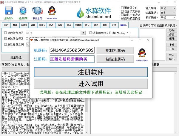 水淼·多功能批量排版(试用版)是一款站长必备的新型文本批处理工具,内含的几十种文本处理功能,可以同时执行,如若调整功能执行的先后顺序,可以实现不同样式的排版。这对于网站结构庞大,数据量繁重的站长来说,使用起来非常的方便,不仅是因为这里功能种类齐全,更多在于无需编码即可执行,且不同功能分区有着多项操作和类型可供选择,因此能实现几乎任何一种文本处理需求。
