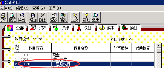 例:1002为银行存款,我们现在要在银行存款下面加二级科目,按照编码原则二级科目编码为两位,所以银行存款的二级科目编码为100201(建设银行)如下图: