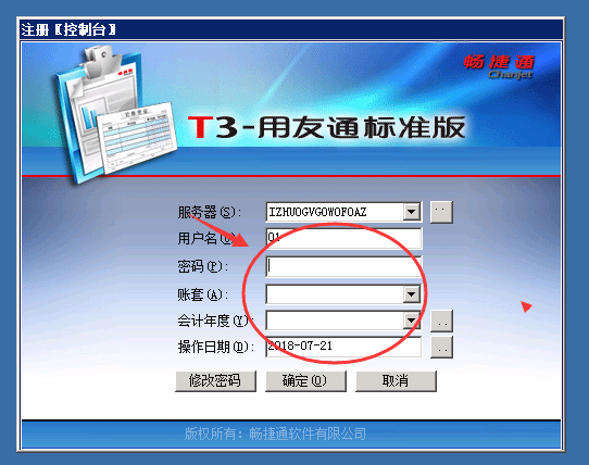 打开T3图标,进入T3的登录界面,输入你的用户名和密码(没有密码也要点一下密码框,常用用户名01、02)。选择你要登录的账套、年度,设置你的操作日期,一般做哪个月的帐就用哪个月的日期登录。