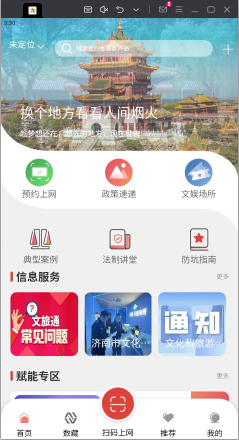 山东省文旅通电脑版是运行在安卓模拟器上的一款为广大网吧经营场所和上网用户提供查看附近网吧、线上预约网吧、实名认证、网吧信息发布等服务功能的电脑软件,其是基于电脑上的安卓模拟器运行的。在登录操作方面,软件可以以个人用户身份和网吧经营者或管理人员使用账号进行登录使用。个人用户在登录使用时可以为其提供在线预约附近网吧、ktv、电影院、剧本杀场所文旅场所服务,还提供了一键扫码上网、以及山东全省景区推荐、旅途食宿订阅等相关服务。