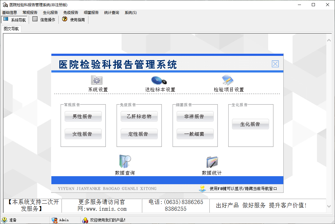 医院检验科报告管理系统是由宏达软件开发的一款非常实用的检验报告管理系统,主要的模块有:基础信息、常规报告、生化报告、免疫报告、细菌报告、统计查询,它集检验科报告录入、打印、查询、修改、统计于一体,采用录入窗口、表格录入模式,满足不同客户的不同要求。软件界面友好、美观、大方,运行时占用系统资源少,有需要的朋友可以下载体验。