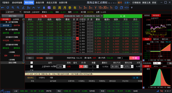 3、支持标的报价画面字段排序,并与期权T型报价联动,标的和期权分时图和K线图实现同时间轴对比分析