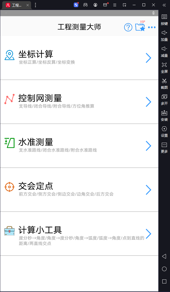 工程测量大师电脑版是一款基于安卓模拟器运行的非常方便的建筑工程现场测量计算软件,此软件计算简单、功能强大、界面干净、无冗余功能,拥有包括控制测量、水准高程计算、坐标正反算、交会定点、面积计算等多种功能,是工程测量技术人员的好助手。感兴趣的朋友不妨下载试试看,相信一定不会让你失望的。