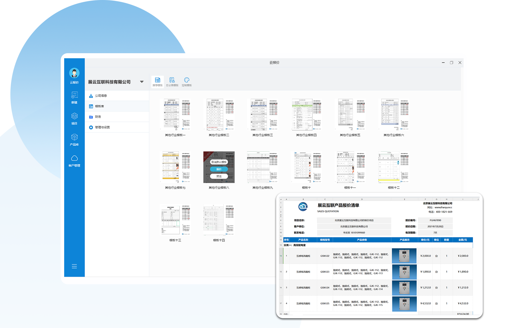 展云云报价软件主要提供了电脑客户端和手机客户端同步进行操作的功能,可随时上传、下载并发送图片和相关文件,并通过内置计算公式快速准确生成EXCEL格式报价单,能够实现对企业项目报价完善的流程控制,有效解决了AV租赁业务人员带着电脑到处跑的麻烦,节省时间和费用,提高客户满意度,有需求的朋友请下载体验。